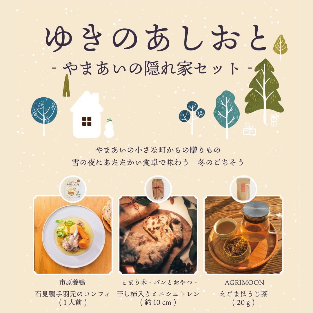 HACOZUME kawamotoがお送りする第4弾 やまあいの小さな町からのおくりもの。 冬にあたたかい食卓で味わうHACOZUME kawamotoの冬のごちそう。 セット内容 ・石見鴨 手羽元のコンフィ (1人前 210g 賞味期限:2026年8月26日) ・干し柿入りミニシュトレン (約10cm 賞味期限:2026年1月10日) ・えごまほうじ茶 (20g 賞味期限:製造日より6ヶ月) 〜店頭でのお渡しについて〜 店頭で受付させていただいた方に限らせていただきます。 本商品は12月12日より、かわもと道の駅でも販売いたしますのでそちらもご利用ください。 ※配送料は別途いただきます。 ※ご購入いただいた方がお届け先と異なる場合はカートに入れた後、お届け先のご住所もご記入ください。 ※配送のお時間をご指定いただけます。